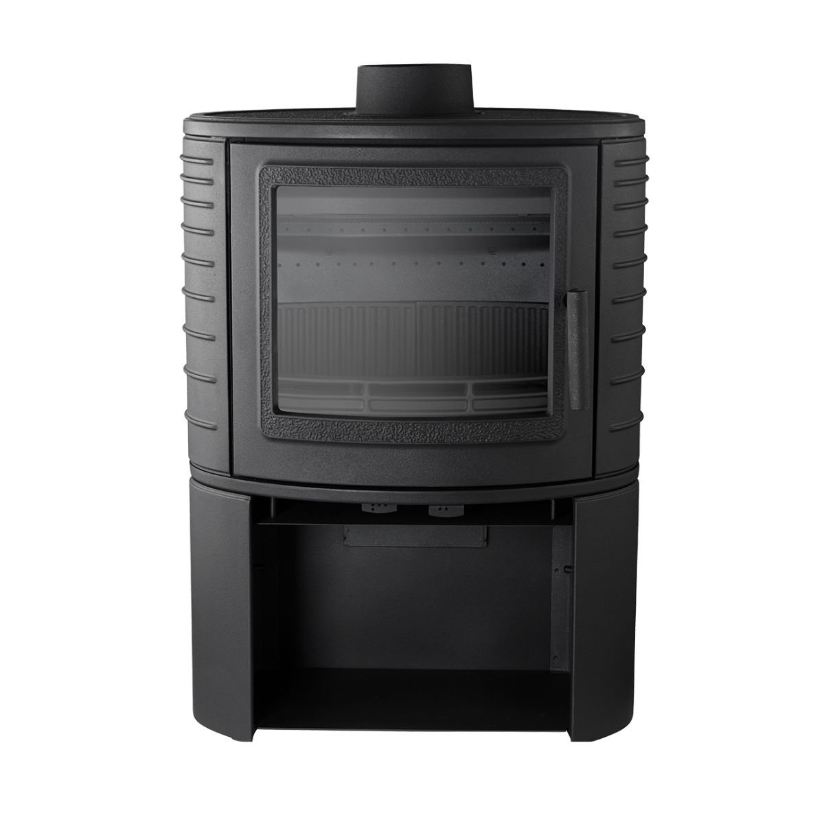 The Cambridge stove, is a modern, full cast iron fireplace with oval body and glass with built-in log storage. It has an impressive secondary/tertiary burn and twin baffle design, working in tandem to recycle the initial smoke produced by fire and continue to burn it off before it is expelled from the stove.